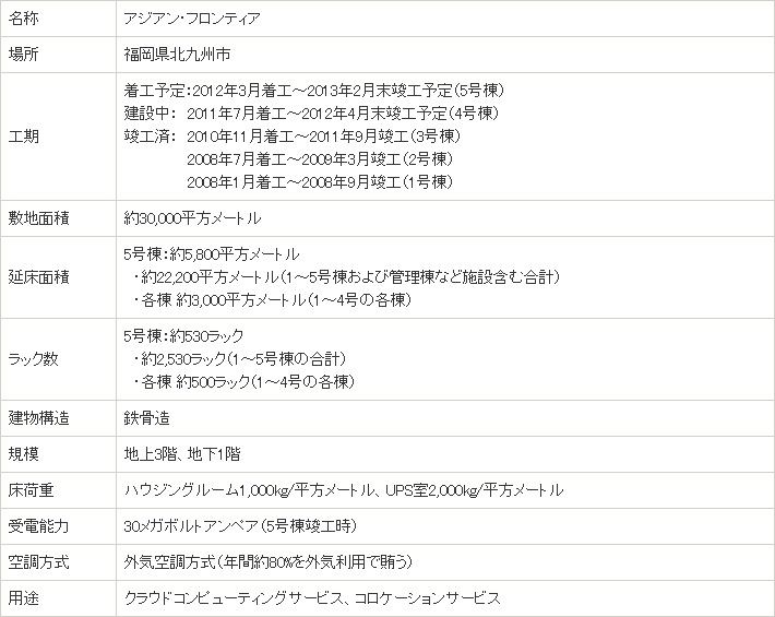 なお、現在建設中で2012年9月末に竣工予定の新白河データセンター(仮称:福島県白河市)でも同様の設計を導入しています。今回増設するアジアン・フロンティアの概要については、以下のとおりです。