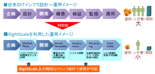 また、従来からの方式であるインフラの企画→設計→開発→構築→検証→監視→運用の流れを、企画後の設計から開発はテンプレートでのノウハウ取得、構築から運用はRightScale Platformで一括運用を行うことが可能で、従来の工数を大幅に簡素化し、運用コストの削減とITエンジニアの新たな業務サイクルを実現しています。