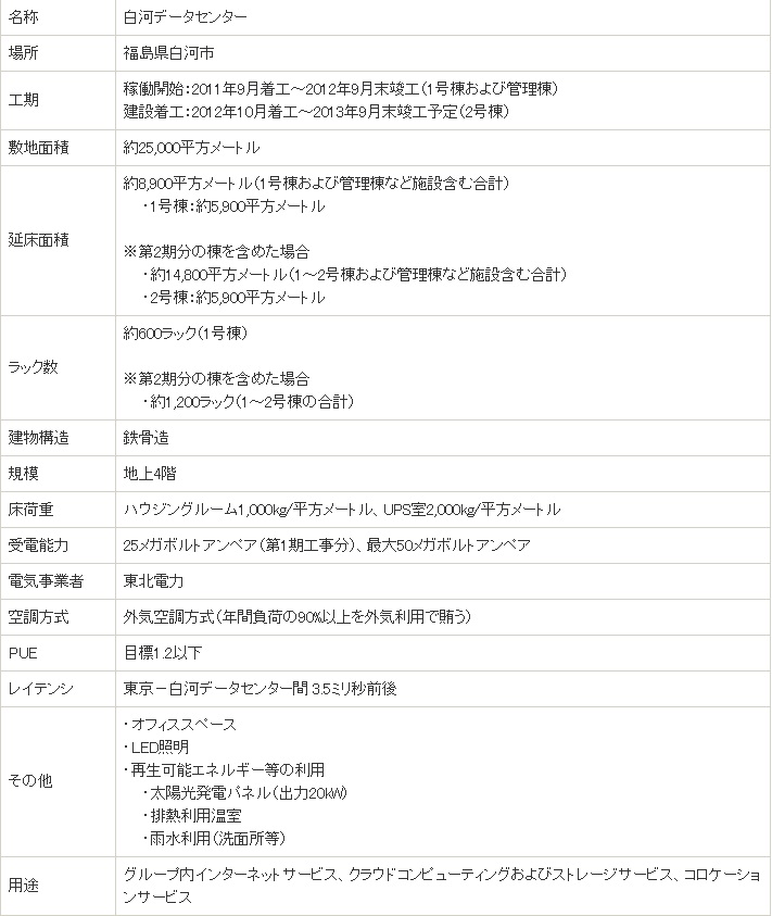 この度の白河データセンターの稼働により、大規模データセンターが首都圏、東日本、西日本の国内3拠点をバランスよくカバーすることになり、拡張余力の乏しい都市型データセンターからの大型移設需要に応えるとともに、万が一の災害に備えた首都圏以外でのバックアップやデータの広域分散を実現してまいります。また、Yahoo! JAPANグループのインターネット事業におけるインフラ基盤の強化を図り、クラウドコンピューティングやストレージサービスの東日本拠点として展開していくことを予定しております。