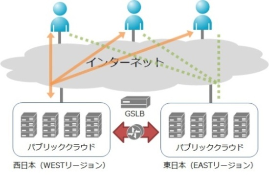 パブリッククラウドの異なるリージョン間を接続し、広域分散クラウドとしてシステム構築が可能。物理的な障害の影響を避けることができ、GSLB(Global Server Load Balancing:広域サーバー負荷分散)との組み合わせにより負荷分散やバックアップサイトへの自動切り替えも可能。