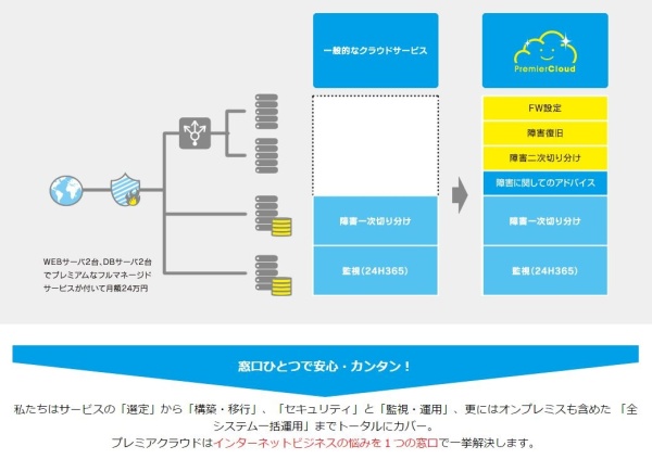 日本エンタープライズが、自社モバイルコンテンツ運営で培ったノウハウを活かして提供する、クラウド型統合運用監視サービス『プレミアクラウド』は、「(1)高可用なクラウドインフラ」、「(2)24時間365日のシステム監視」、「(3)障害切り分け~障害復旧」、「(4)障害に対するアドバイス」、「(5)ファイアウォール等のネットワーク設定」を基本パッケージとし、月額固定料金で、申込みから最短2日で利用開始可能なサービスです。