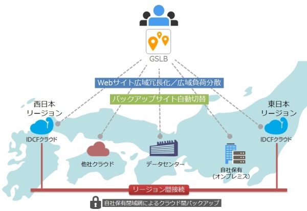 本サービスにより、Webサイトへ予測できない負荷集中が発生した際やシステム障害時には、最適なパフォーマンスが得られるサイトへの振り分けやバックアップサイトへの自動切り替え、一時的な案内ページ(Sorryページ)の迅速な表示などを、物理的に離れたクラウドやデータセンター、オンプレミス間で容易に設定できます。また、IDCFクラウドでは、物理的に1,000km以上離れた東日本および西日本のサービス提供地域(リージョン)同士を、自社の閉域網を用いて無料で接続する「リージョン間接続」を利用して、冗長化やデータのバックアップを行うことが可能です。