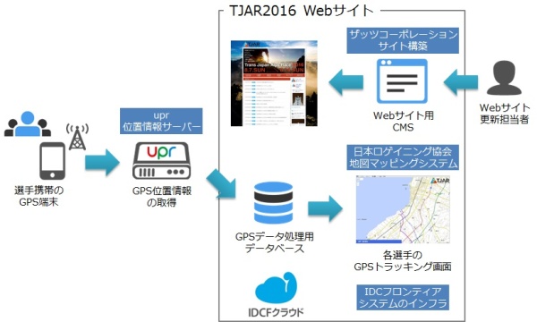 本GPSトラッキングシステムでは、選手が携帯するGPS端末から一定時間ごとに送られてくる位置情報をuprのサーバーで取得し、ロゲイニング協会の地図マッピングシステムで各選手がどこを走行しているかリアルタイムでTJAR公式サイトの地図上に表示します。WebサイトのCMSと収集した各選手の位置情報データはIDCFのクラウドサービス「IDCFクラウド」でGPS情報等のデータが処理され、WebサイトのCMSやサイトデザインはザッツコーポレーションが構築しています。