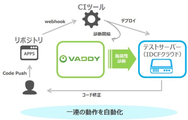 「VAddy」は、Webアプリケーション開発者自身が脆弱性検査を実施できる、新しい発想のクラウド型セキュリティテストサービスです。AIの技術を利用した独自の脆弱性検査エンジンで、ユーザーのアプリケーションの動きを自動的に把握するので、セキュリティについての特別な知識がなくても簡単に利用できます。また、JenkinsやCircleCI(*2)などの継続的インテグレーション(CI)(*3)ツールと連携できる手軽さから、2016年11月現在で全世界58ヶ国1000以上の開発現場で利用されています。