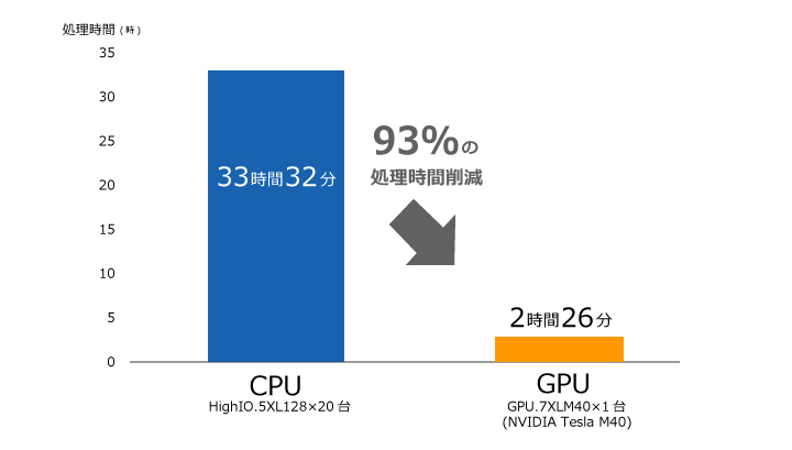 一般的な動画に対してこれらの処理を適応するには、多大なコンピューティングリソースと時間が伴いますが、ディープラーニング用途に適し、膨大なデータの高速演算処理が可能なIDCFの「NVIDIA(R) Tesla(R) GPUアクセラレータ M40」を搭載したクラウドサーバー1台を用いることで高いパフォーマンスを実現し、CPUのクラウドサーバー20台の場合と比較して33時間32分から2時間26分となる93%の処理時間短縮と、ディープラーニングを用いた処理を安価に行うことが可能となりました。