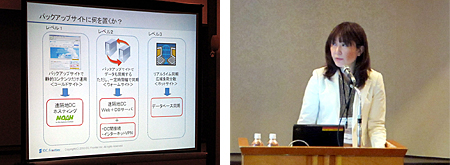 講演を通じ、片岡は企業サイトの事業継続性の確保や、ダウンタイムを最小限に抑えることが重要であると紹介し、万が一の大規模災害や障害時などに備え、「マネージドGSLBサービス」を導入することで、設備投資や運用負荷を増大させることなく低コストでの事業継続性対策が可能であると述べました。