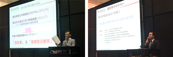 中西は「東京都環境確保条例の動向と震災後の状況について」と題し、総量削減義務と日本データセンター協会の対応や基準排出量変更の手引書、また震災後における東京都の対応と今後の動向を、山中は「日の丸データセンターの国際競争力」と題し、データセンターにおける国際競争力増進のための提言書骨子や、震災後の対応事例、DatacenterDynamics(サンフランシスコ)での講演など、ワーキンググループでの主な活動をご紹介いたしました。