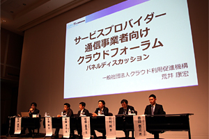 また、「サービスプロバイダー/通信事業者向けクラウドフォーラム」では、クラウド利用促進機構の荒井氏をモデレータに、SCSKの川村氏、NTTコミュニケーションズの森田氏、ユニアデックスの松隈氏、ライトスケール・ジャパンの新藤氏と共に大屋も登壇し、CloudStackを選択した理由やサービスの構築で苦労した点などをテーマにパネルディスカッションが行われました。
