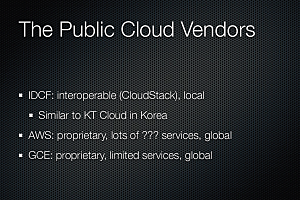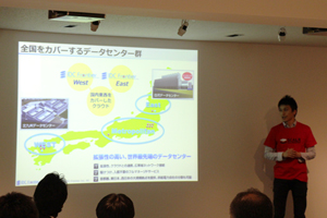 続いて、「IDCフロンティアアップデート」として弊社技術本部 サービス開発部の寺門が講演させていただきました。白河データセンター稼働開始によるメガ拠点完成とその有用性のご説明、オンラインゲーム会社のお客様事例を使ったクラウドの利用方法や具体的な構成のご紹介、さらに、データセンターとクラウドをそれぞれ独立したものでなく、シームレスにご提供できる弊社の特長をお話させていただきました。