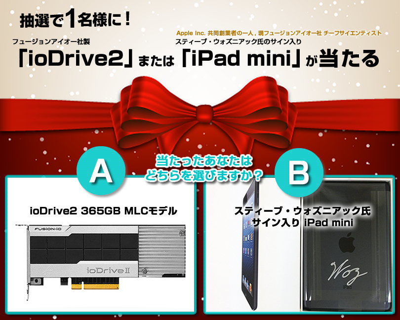 当たったあなたはどちらを選びますか?フュージョンアイオー社製「ioDrive2」またはスティーブ・ウォズニアック氏のサイン入り「iPad mini」