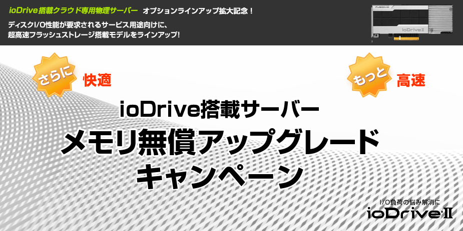 これを記念して、「ioDrive」搭載のクラウド専用物理サーバー高速ストレージタイプ のメモリ無償アップグレードキャンペーンを開催します。