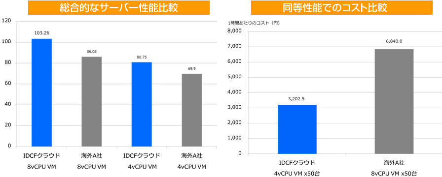 さらに、vCPU数の同じ仮想マシンとの比較では4vCPU、8vCPUいずれも当社の仮想マシン性能が上回る結果が示され、同等性能における費用面での比較においても、コストパフォーマンスの優位性が顕著に表れました。
