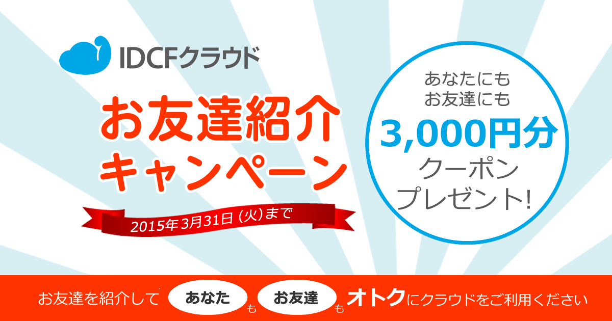 終了しました:お友達紹介キャンペーン実施!「IDCFクラウド」3,000円分のクーポンプレゼント!