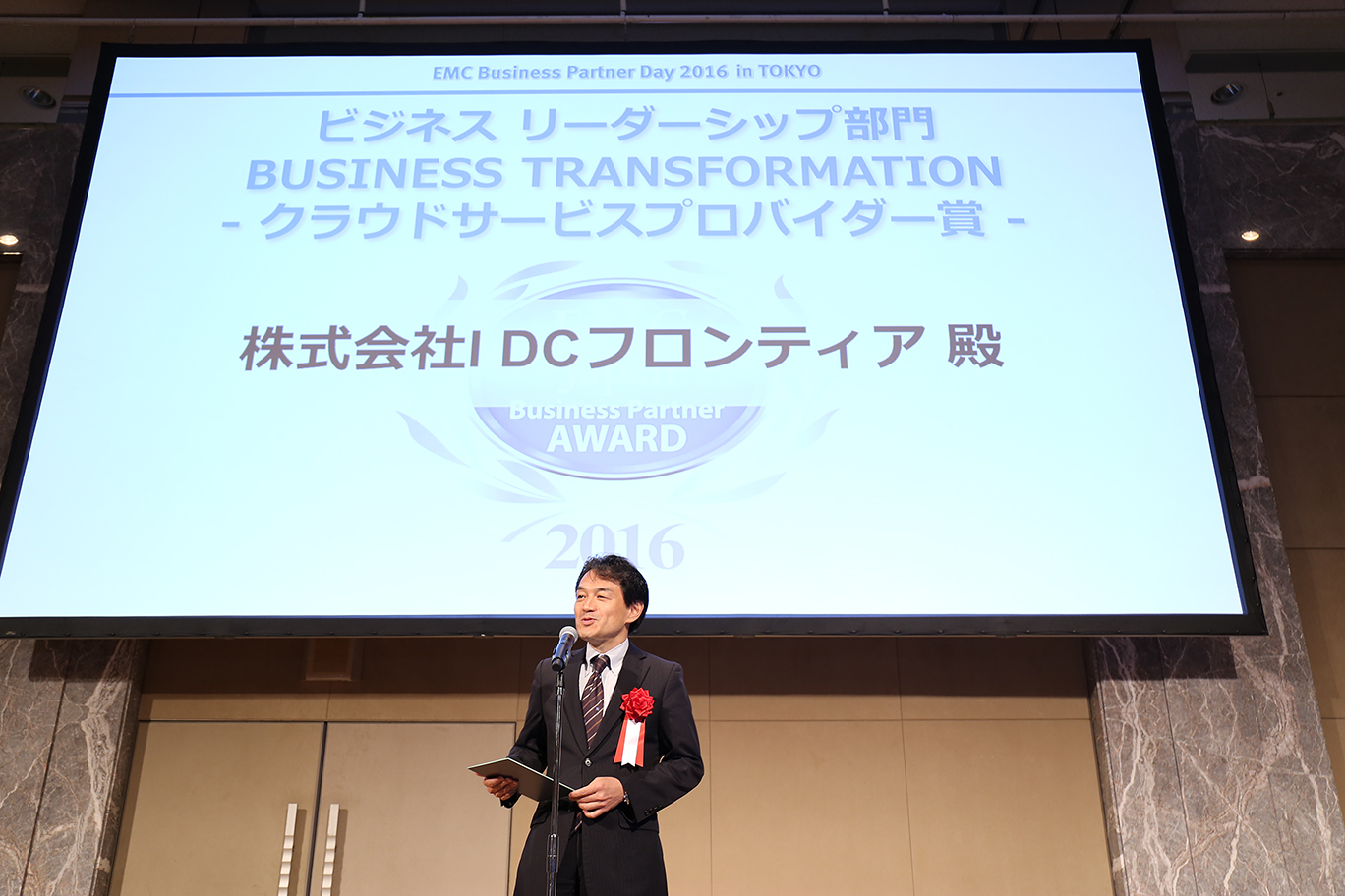 IDCフロンティアがEMCジャパン社主催の「EMC Japan Business Partner Award 2016」において、ビジネス リーダーシップ部門「Business Transformation – クラウドサービスプロバイダー賞」を受賞いたしました。