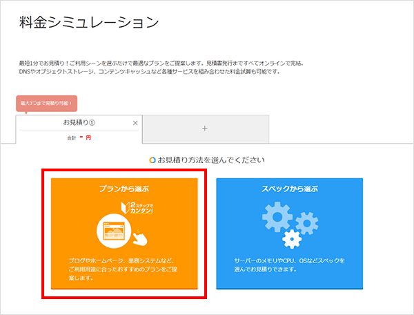 1.料金シミュレーションより「プランから選ぶ」「スペックから選ぶ」をクリック。
