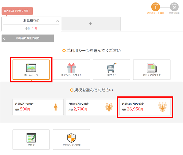 今回新たに、キャンペーンサイトや業務システムなど「ご利用シーン」を選ぶだけで、わずか2ステップ、最短1分でお見積書を発行できます。