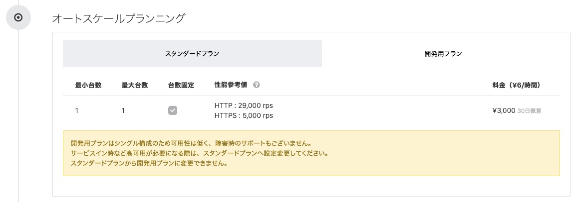 なお、「開発用プラン」はインフィニットLBの新規作成時に「オートスケールプランニング」にて選択が可能です。