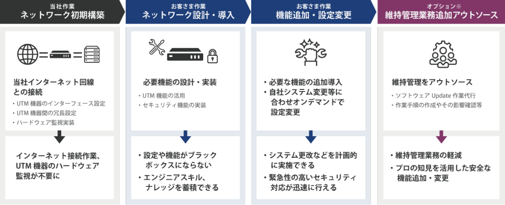 UTM機器を導入する際のインターネット回線接続などネットワーク初期構築と、ハードウェア監視は、IDCフロンティアが実施するため、お客さまは維持管理業務の負担を軽減することができます。